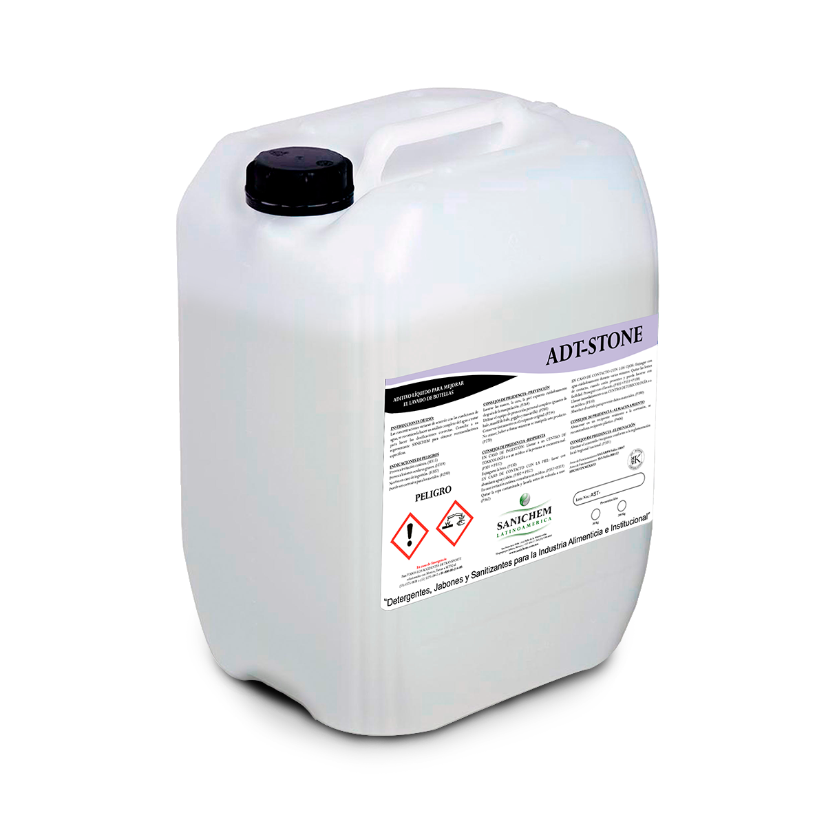 ADT -STONE es un aditivo líquido altamente concentrado desarrollado para evitar incrustaciones y mejorar la efectividad del enjuague de la botella de vidrio durante el pre-enjuague final.