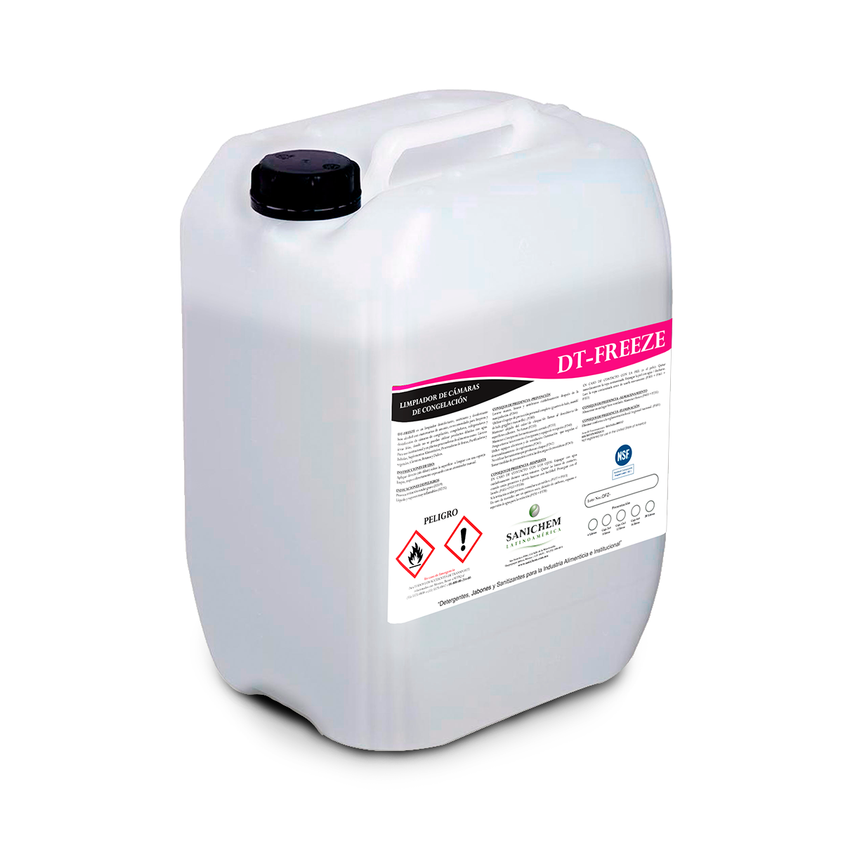 DT -FREEZE es un limpiador desinfectante, sanitizante y deodorizante base alcohol con cuaternarios de amonio, es recomendado para limpieza y desinfección de cámaras de congelación, congeladores, refrigeradores y áreas frías, donde no se puedan utilizar productos diluidos con agua.