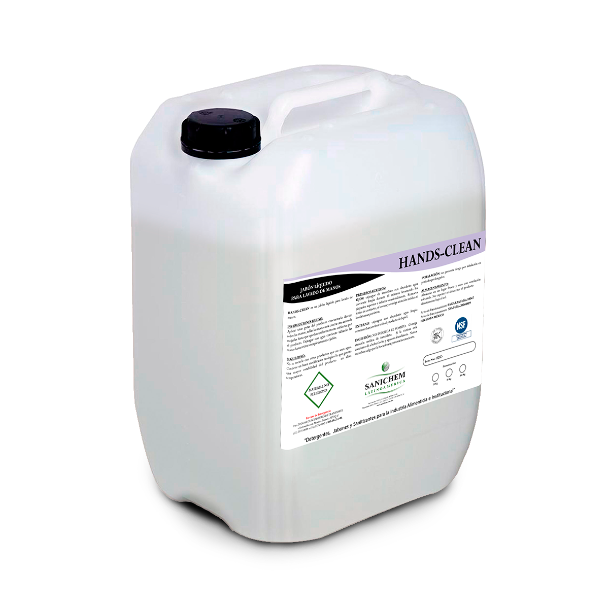 HANDS-CLEAN es un jabón liquido concentrado para el lavado de manos, formulado para su uso en todo tipo de plantas procesadoras de alimentos industriales e institucionales como: Industrias Lecheras, Cárnicos, Embotelladoras, Rastros, Confiterías, Hoteles y Restaurantes.