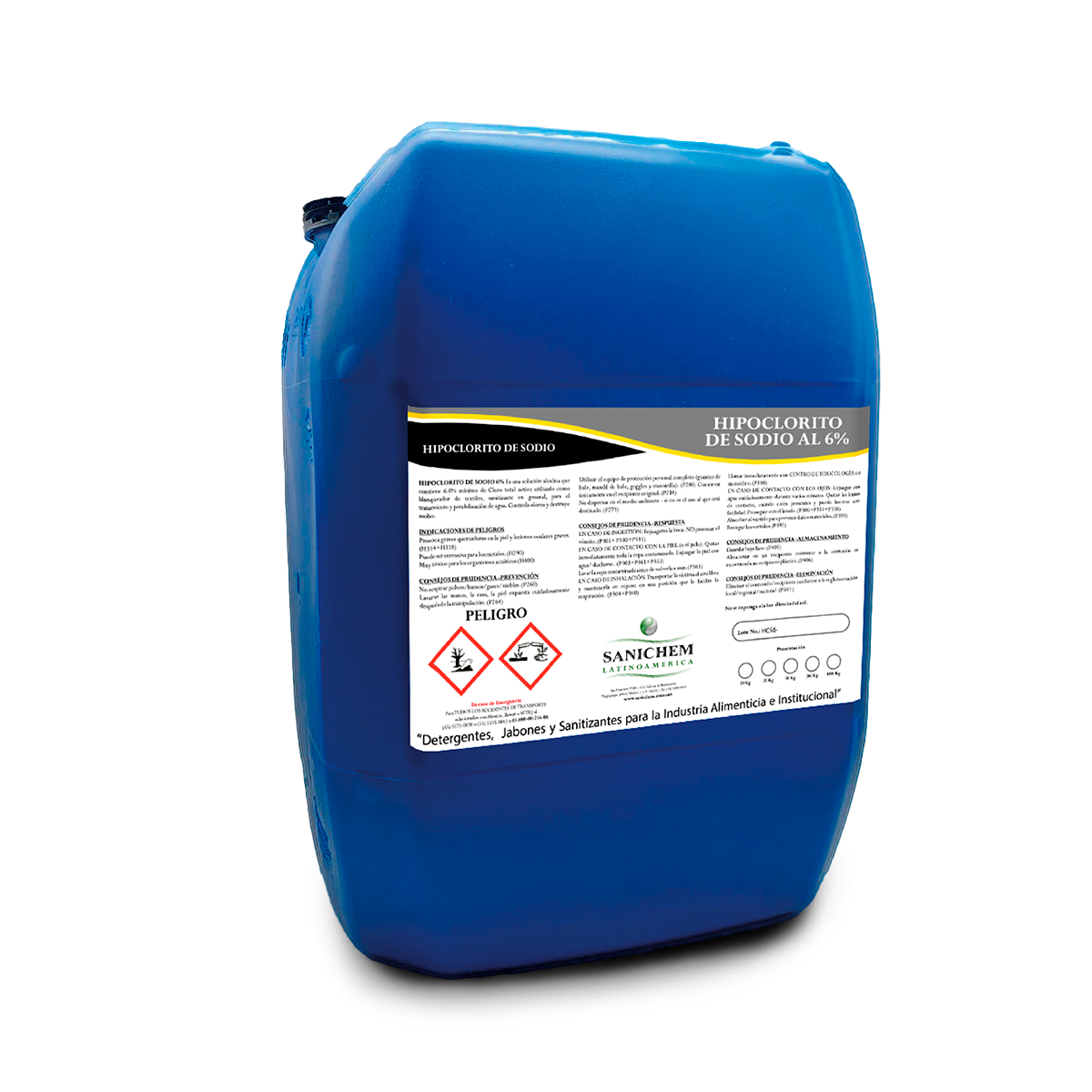 HIPOCLORITO DE SODIO 6% Es una solución alcalina que contiene 6.0% mínimo de Cloro total activo utilizado como blanqueador de textiles, sanitizante en general, para el tratamiento y potabilización de agua. Controla olores y destruye moho.