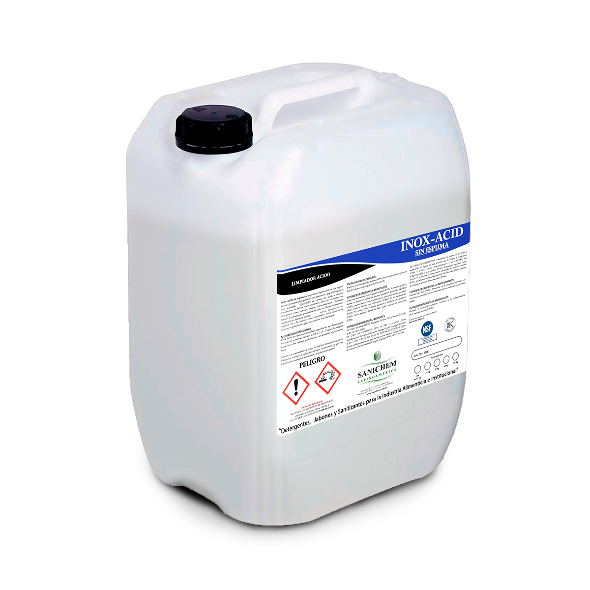 INOX-ACID sin espuma, es un producto liquido ácido de olor púgnate irritante, formulado principalmente para limpieza de equipos fabricados en acero inoxidable. INOX-ACID nos ayuda a remover incrustaciones de durezas como: carbonatos, sílice, etc. en equipos con recirculación como, tuberías, tanques, intercambiadores , lavadoras, sistemas de enfriamiento, generadoras de hielo, etc. Usados normalmente en industrias de: alimentos, bebidas, textil, farmacéuticas, tequileras, etc.; en sectores como: restaurantes, sector salud, sector hotelera y en general todo equipo y accesorio de acero Inoxidable.