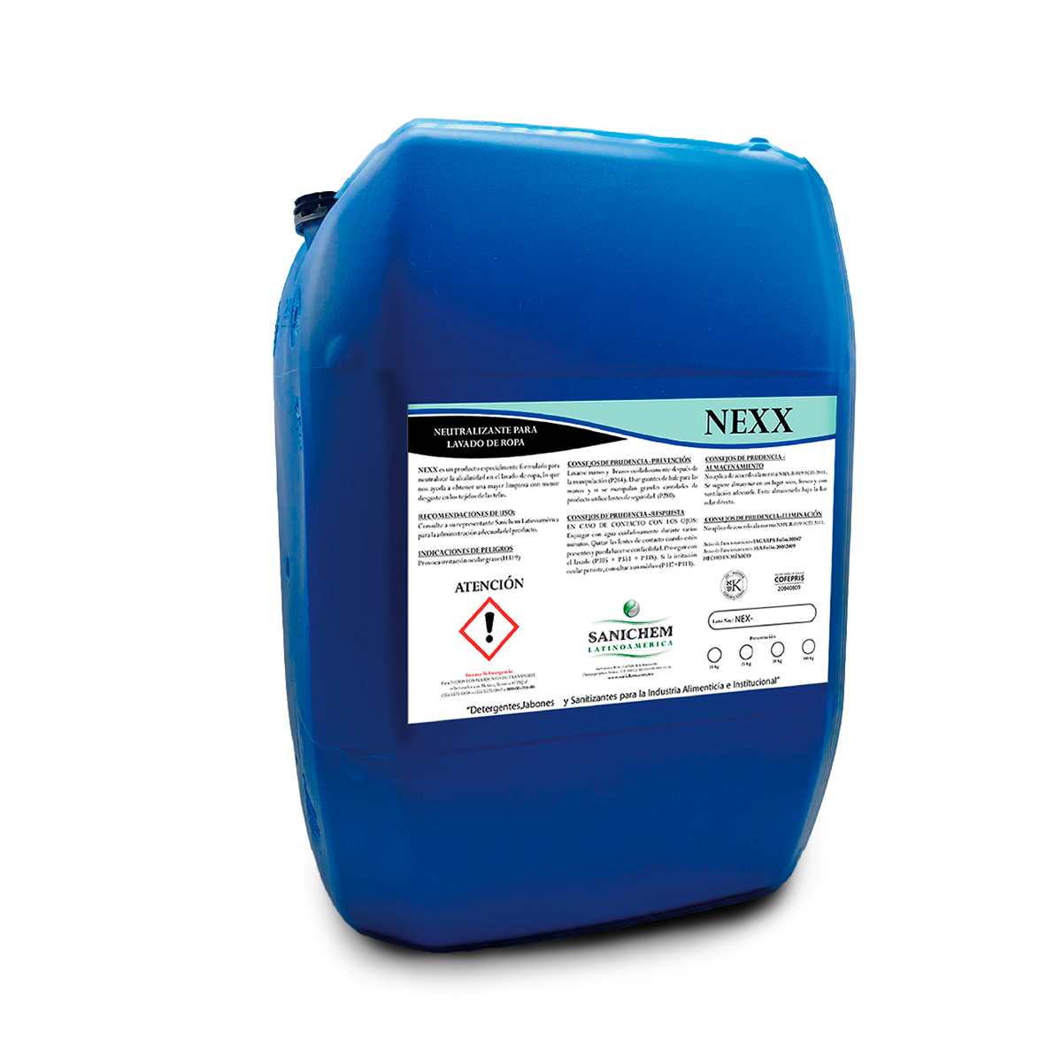 NEXX es un producto liquido especialmente formulado para neutralizar la alcalinidad en el lavado de ropa, lo que nos ayuda a obtener una mayor limpieza con menor desgaste en los tejidos de las telas.